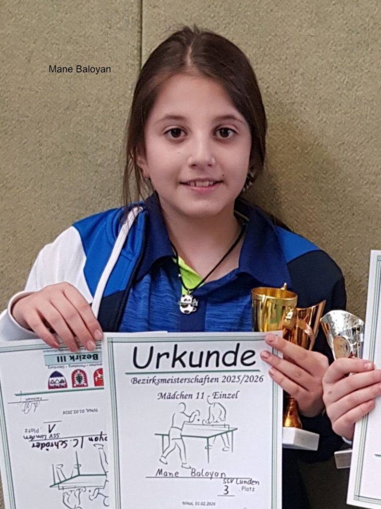 Bei den Bezirksmeisterschaften der Kreise Pinneberg/Steinburg und Dithmarschen am 1. Februar in Wrist überzeugten die Mädchen erneut: Carolina Schröder wurde Zweite, Mane Baloyan Dritte im Einzel der U11. Gemeinsam holten sie sich sogar den 1. Platz im Doppel. Johanna Brandt erreichte bei den Mädchen U13 einen starken 5. Platz. Alle drei qualifizierten sich damit für die Landesmeisterschaften.