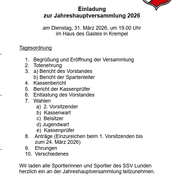 Am 31. März findest im Haus des Gastes die Jahreshauptversammlung vom SSV Lunden statt. Wir freuen uns auf viele Teilnehmer und Teilnehmerinnen.